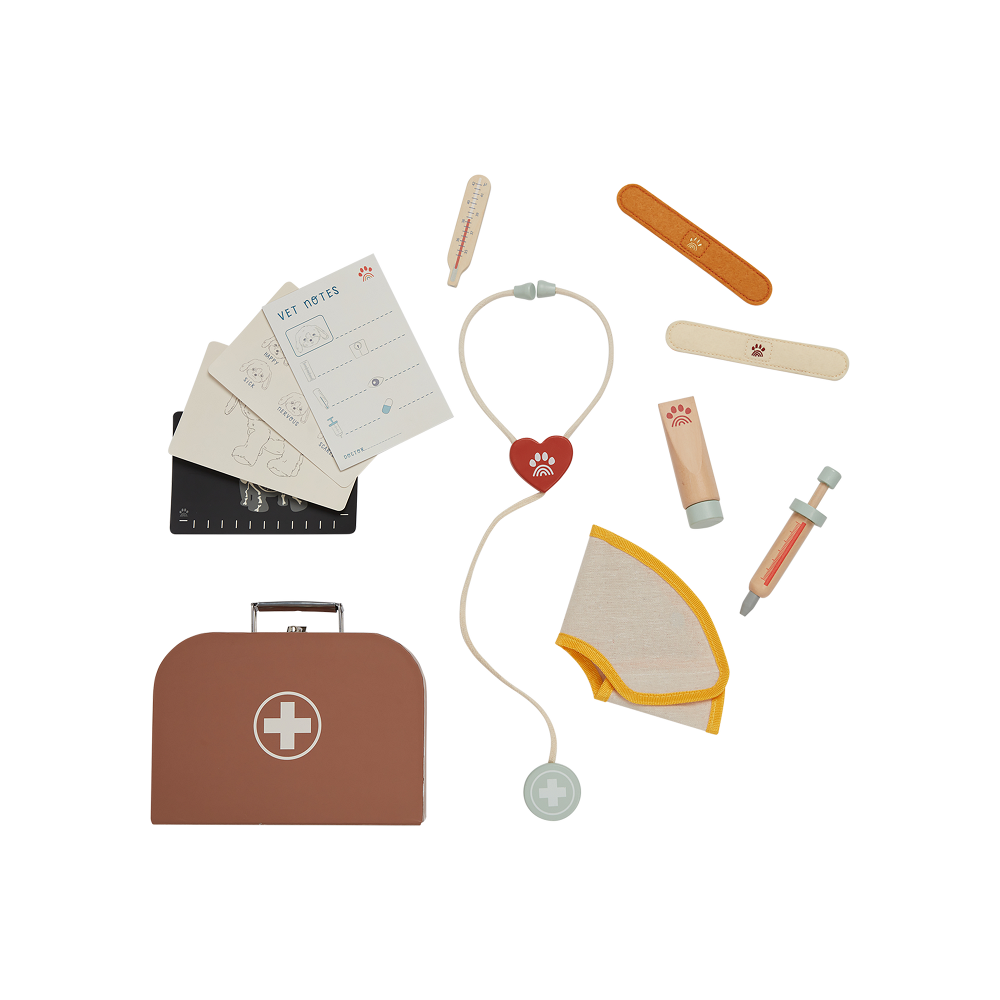 • Vet Set includes a magnetic thermometer for Dinkum Dog to hold in their mouth, wooden stethoscope, wooden ointment tube, wooden syringe, wooden thermometer, x2 felt bandages, buster collar, diagnostic cards, and medical records notepad.
